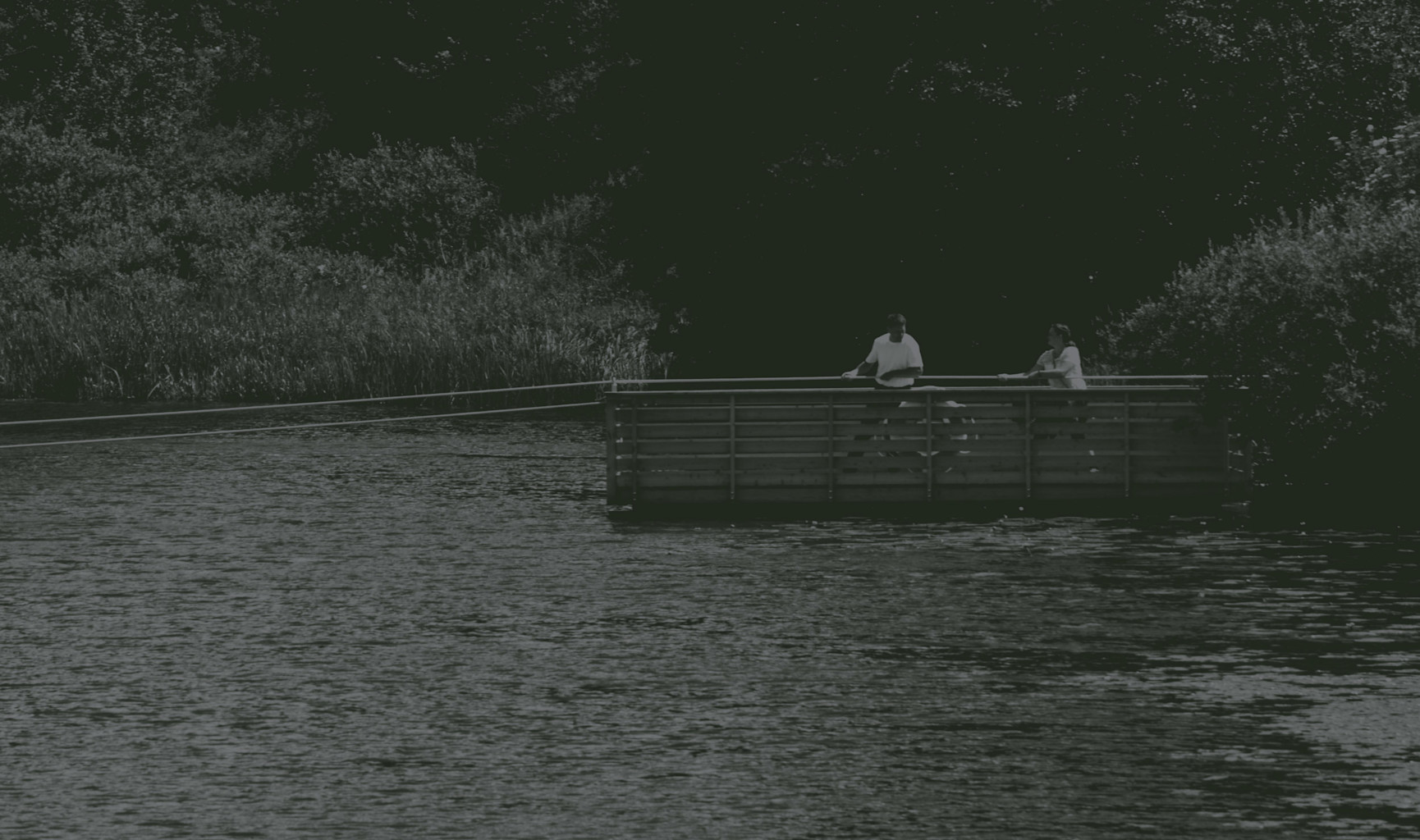 Trækfærgen går mellem dæmningen ved slusehuset og til arealet med får, hvor det lille halvtag står.